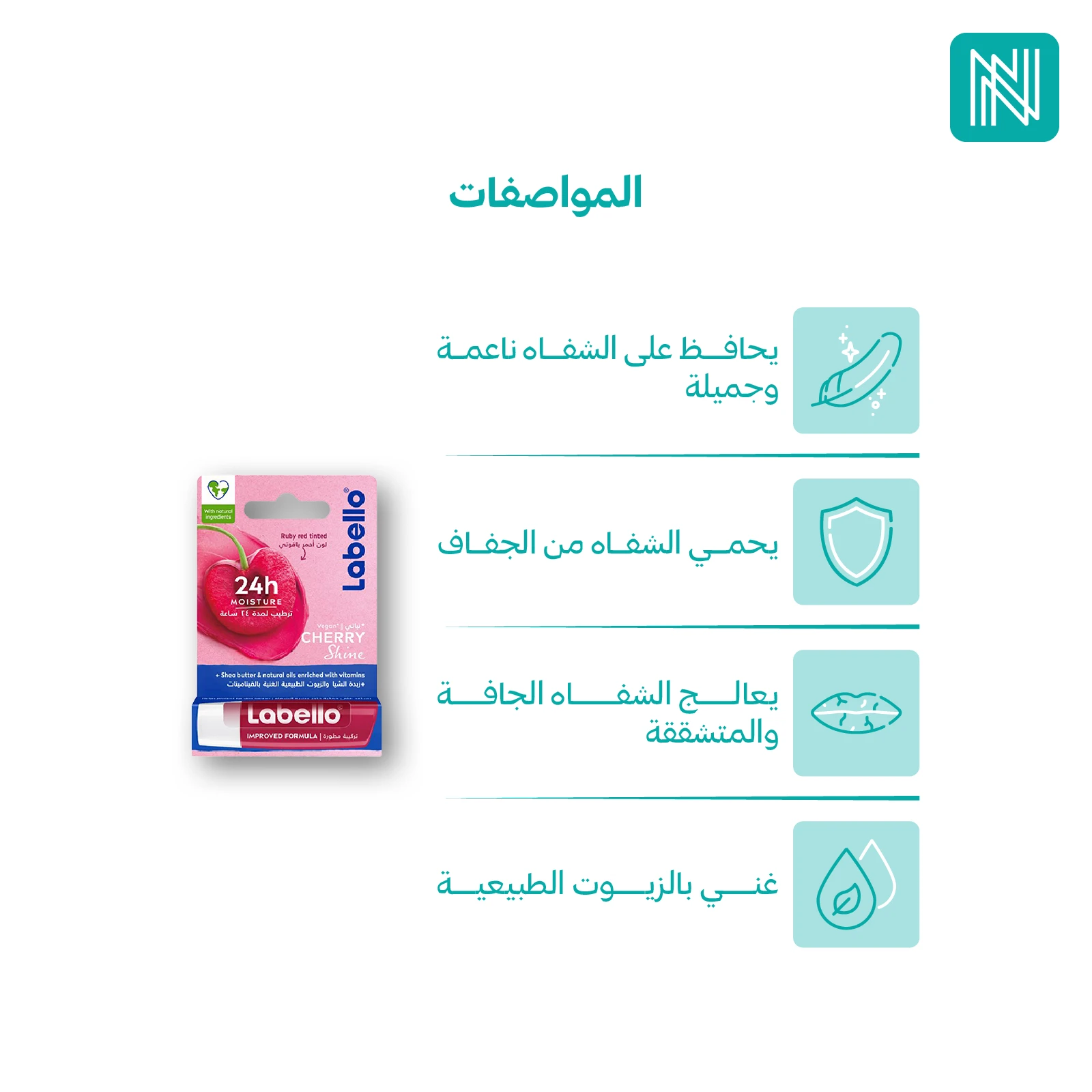 احصلي على شفاه ناعمة ومحمية بشكل مثالي مع بلسم الشفاه المرطب من لابيلو بنكهة الكرز مرطب الشفاه من لابيلو يمنحك ترطيبًا فائقًا يدوم طويلاً، وعناية مكثفة تحمي شفتيك من الجفاف. بتركيبته الغنية بزبدة الشيا المرطبة والبانثينول. المميزات: - يتميز هذا البلسم بسرعة امتصاصه وقدرته على توفير عناية تدوم 12 ساعة. - يحافظ على الشفاه ناعمة وجميلة طوال اليوم. - يحمي الشفاه من الجفاف. - لا يترك أي أثر لون على الشفاه. - يعالج الشفاه الجافة والمتشققة. - يوفر ترطيبًا يدوم طويلاً حتى 24 ساعة. - يُستخدم يوميًا للحصول على أفضل النتائج. - غني بالزيوت الطبيعية.